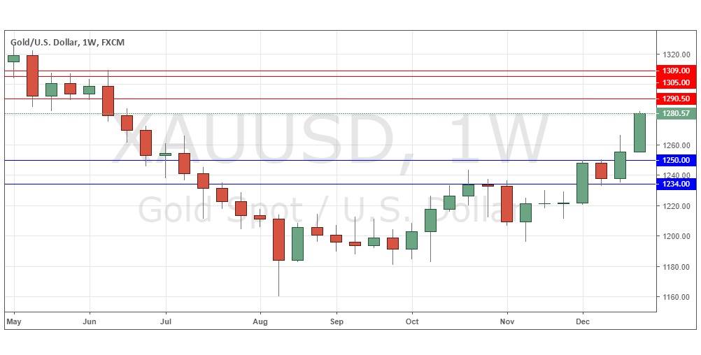 The weekly chart below shows last week produced a reasonably large and strong bullish candlestick. The price continued its rise above the psychologically important $1250 level and made the highest close and highest high seen in over six months. These are significant bullish signs, and the rise is helped by a flight into safe havens such as precious metals while the U.S. begins to show signs of weakening and beginning to end its long-term bullish move. However, we may expect key resistance at about $1290.