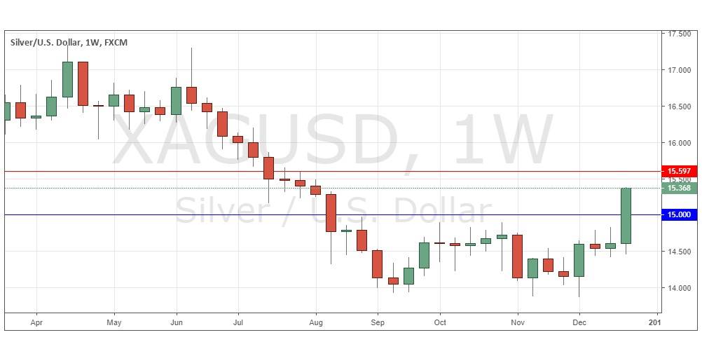 The weekly chart below shows last week produced a very large and very strong bullish candlestick. The price closed above the psychologically important $15 level and made the highest close and highest high seen in over five months. These are significant bullish signs, and the rise is helped by a flight into safe havens such as precious metals while the U.S. begins to show signs of weakening and beginning to end its long-term bullish move. However, we may expect key resistance at about $15.60.