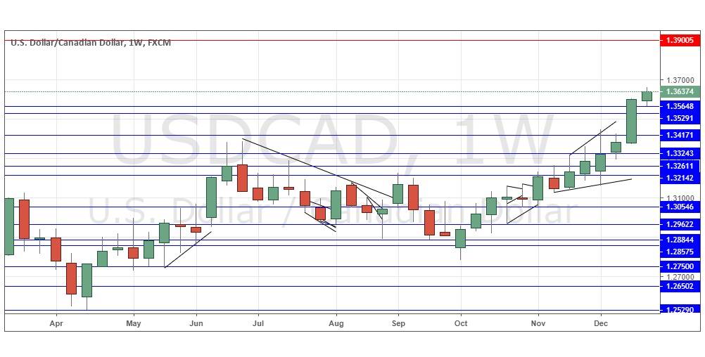 The weekly chart below shows last week produced a small but bullish candlestick, closing quite near its high. These are the highest prices seen in this Forex currency pair for more than 18 months. The price chart below shows how long-term and consistent the trend has been over most of this period, and the trend has accelerated as the price of Crude Oil has dropped sharply and beaten down the Canadian Dollar. All the signs are bullish, and the probability is that we will see still higher prices over the coming week, although there are certainly signs of a weakening in the bullish momentum.