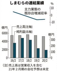 衣料品店チェーンのしまむらは30日、2020年2月期の連結決算を発表した。新型コロナウイルスの感染拡大で、21年2月期の業績と配当を未定とした。20日まで1カ月の主力業態の既存店売上高は前年同期比12%減で、鈴木誠社長は「3月と4月は1割ほど減る見込み」と述べた。年間では増益を計画するが、5月以降も「不透明感がでてきている」とした。