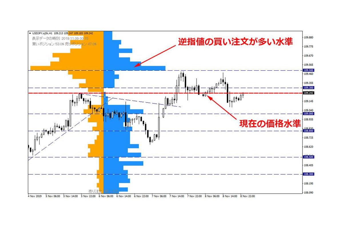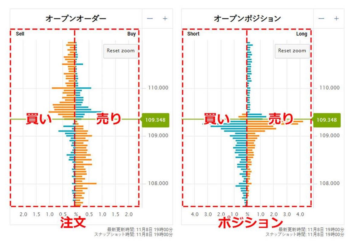 オープンポジションを見ると、どの水準に含み損を抱えたポジションが多いかを視覚的にチェックすることができ、次にどちらに動いた方が、価格の動きが大きくなりそうか(損切り注文が多く出そうか)を予想することができます。