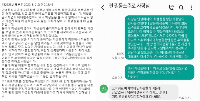 동국대학교 대나무숲(익명 온라인 커뮤니티)에 올라온 학교 앞 술집 사장님의 글이다. 학교 앞에서 6년동안 가게를 운영한 사장님은 코로나19 여파로 결국 폐업을 결심했고 페이스북을 통해 학생들에게 작별인사를 전했다. 이 글은 동국대 학생들의 댓글이 300개 넘게 달리며 화제가 됐다.