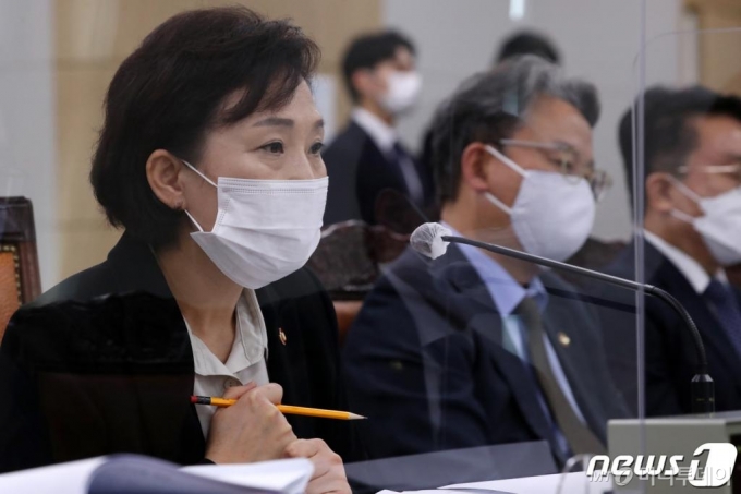 | 김현미 국토교통부 장관이 16일 정부세종청사에서 열린 국회 국토교통위원회의 국토교통부에 대한 국정감사에서 위원 질의에 대한 답변을 하고 있다./사진= 뉴스1 |