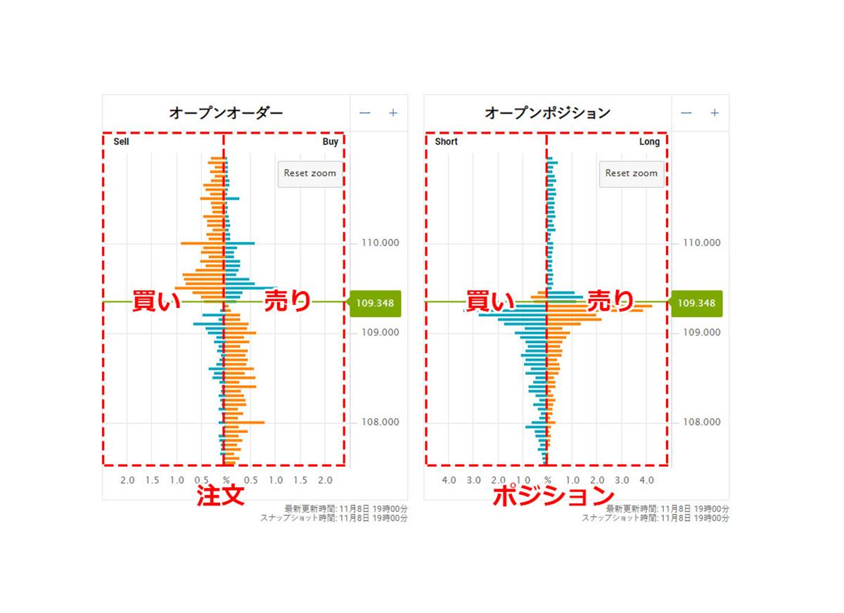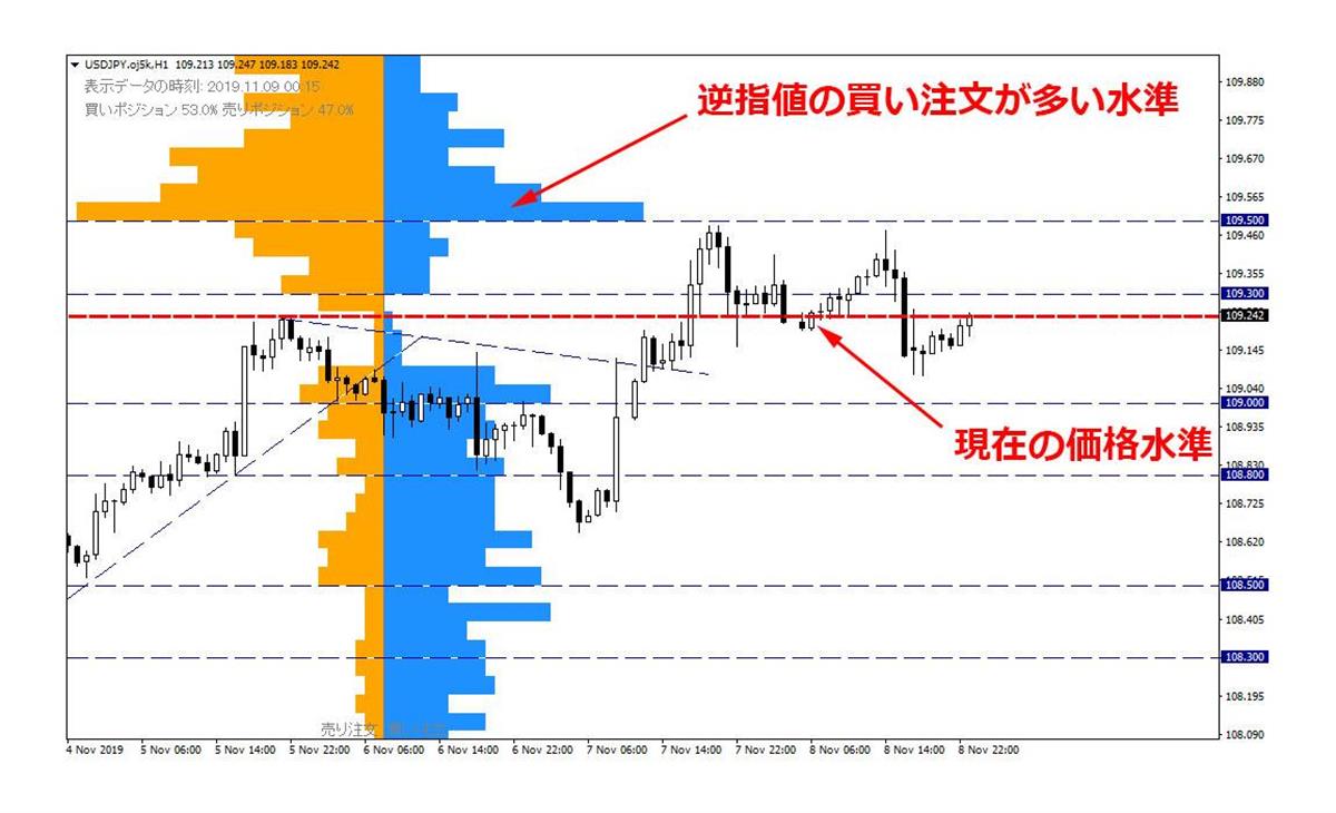 オープンポジションを見ると、どの水準に含み損を抱えたポジションが多いかを視覚的にチェックすることができ、次にどちらに動いた方が、価格の動きが大きくなりそうか(損切り注文が多く出そうか)を予想することができます。